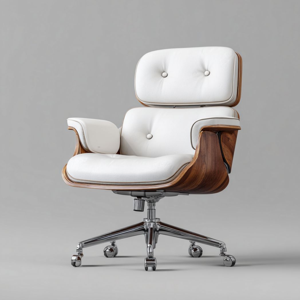 Matériau : Assise et dossier en simili cuir, coque en bois plaqué, base en acier chromé