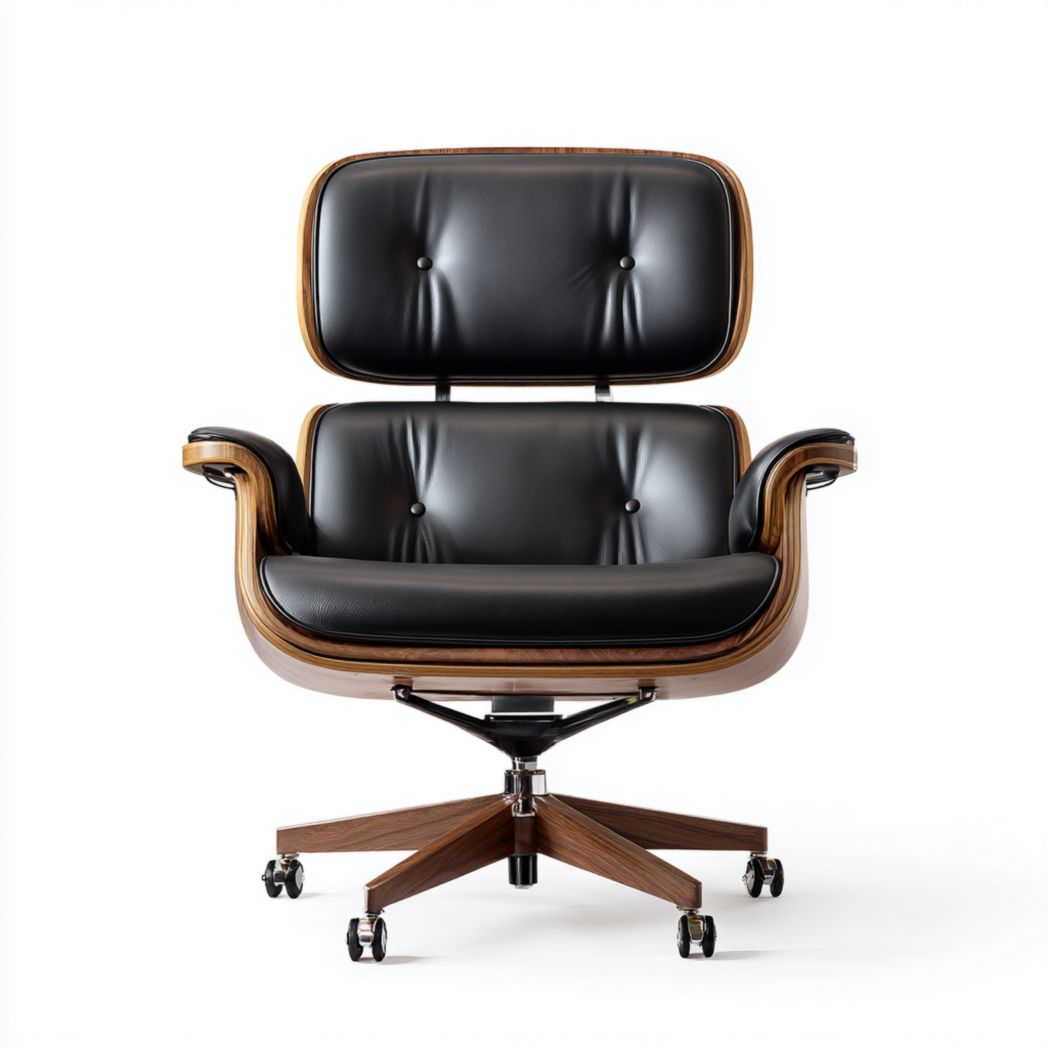 Matériau : Assise et dossier en simili cuir, coque en bois plaqué, base en métal et bois avec roulettes